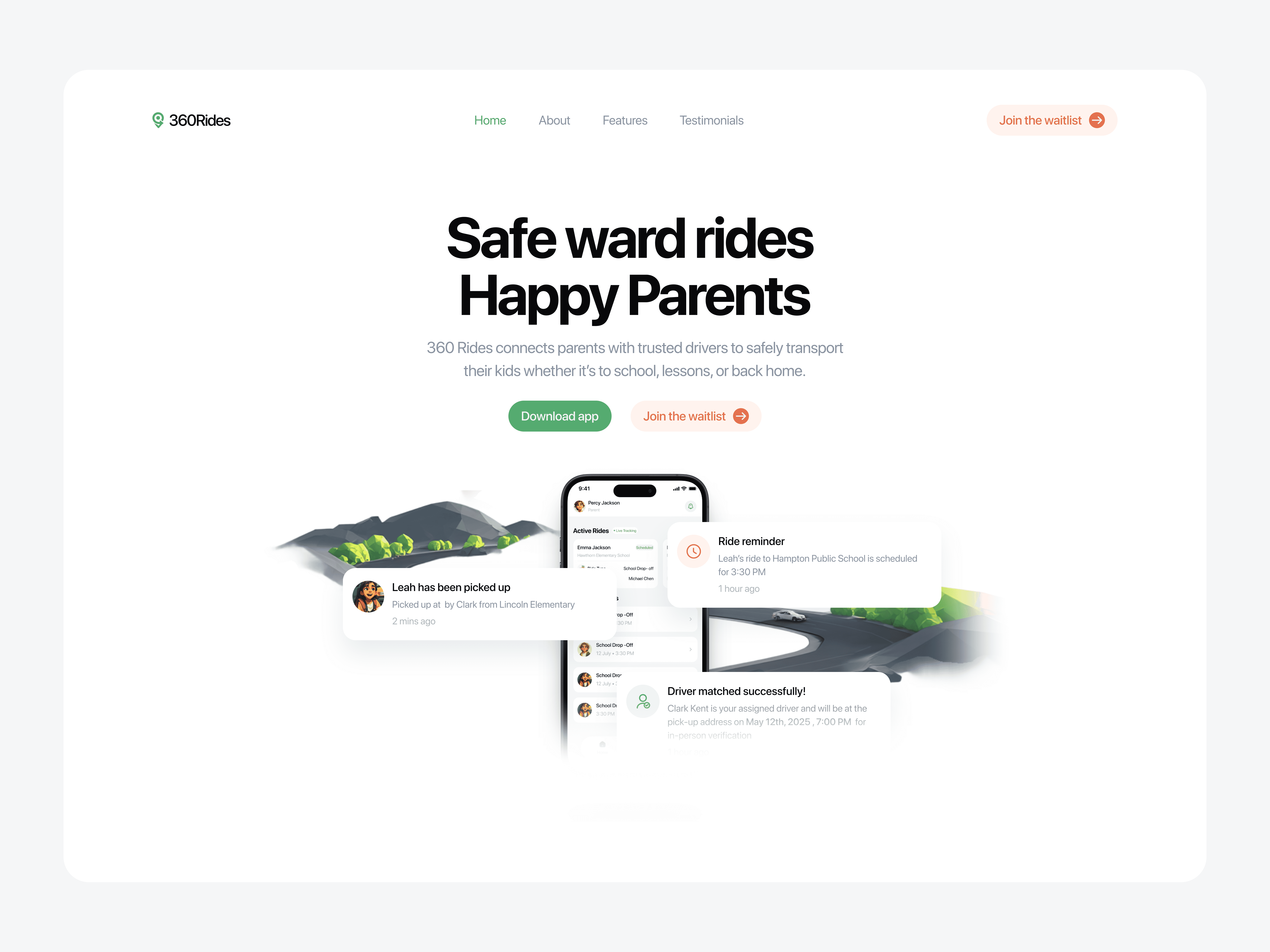 360Rides is a ride platform built to help parents safely coordinate transportation for their children. The product focuses on trust, visibility, and control, ensuring parents know who is driving, where their child is, and what’s happening at every step of a trip